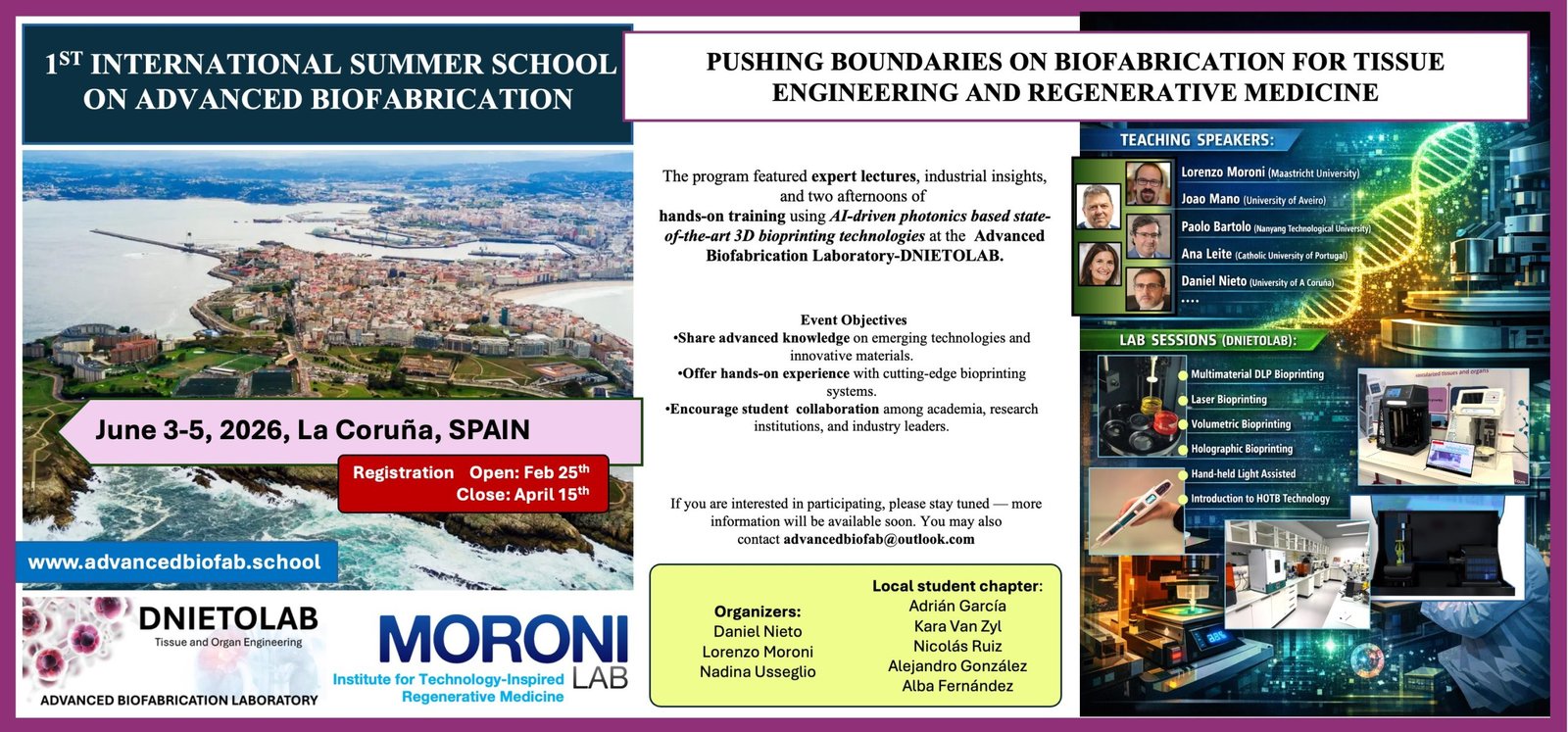 The 1st International Summer School on Advanced Biofabrication & BIOFAB4FUTURE Workshop takes place June 3–5, 2026, in A Coruña, Spain, featuring expert talks, industrial insights, and hands-on training in biofabrication and innovations in tissue engineering and regenerative medicine.